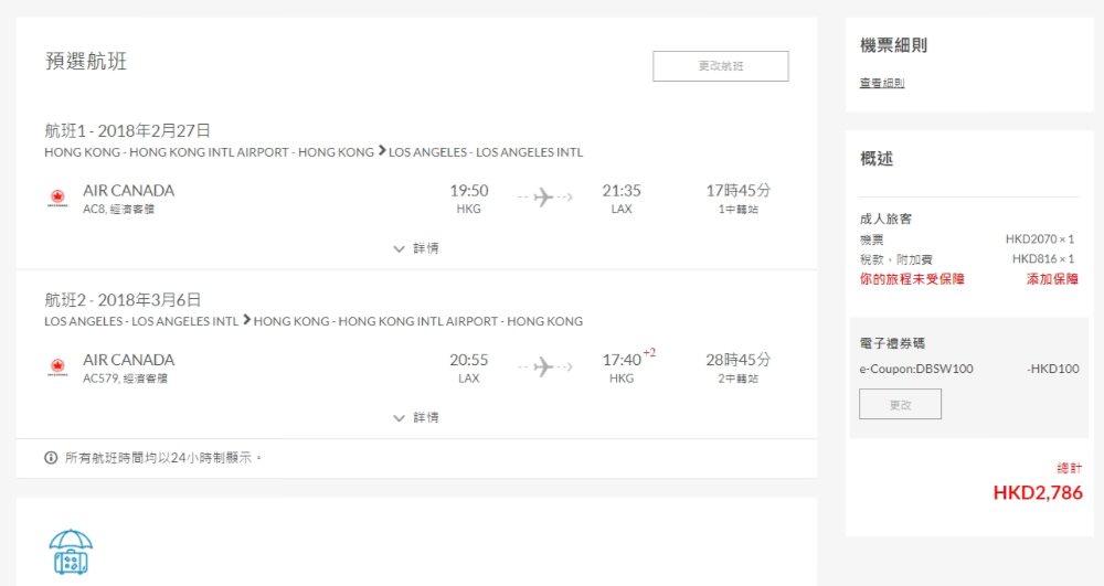 之前國泰又減,港航又減美國航,跟住連加拿大航空 都減,香港經溫哥華轉飛 洛杉磯/三藩市 HK$2,070起,用DBS優惠碼再減HK$100,即HK$1,970(連稅 HK$2,786),雖然要轉機,但佢最吸引係停留期有成3個月咁長,出發日期去到明年11月,加航已包2件23kg行李寄艙。
