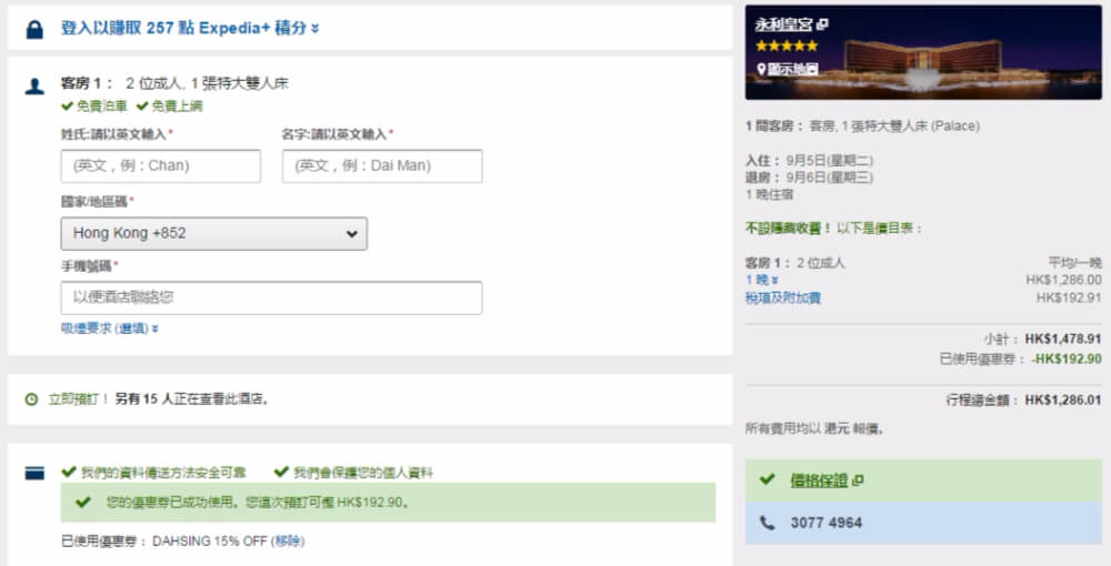 每晚房價 HK$1,286起,85折後連稅 HK$1,286