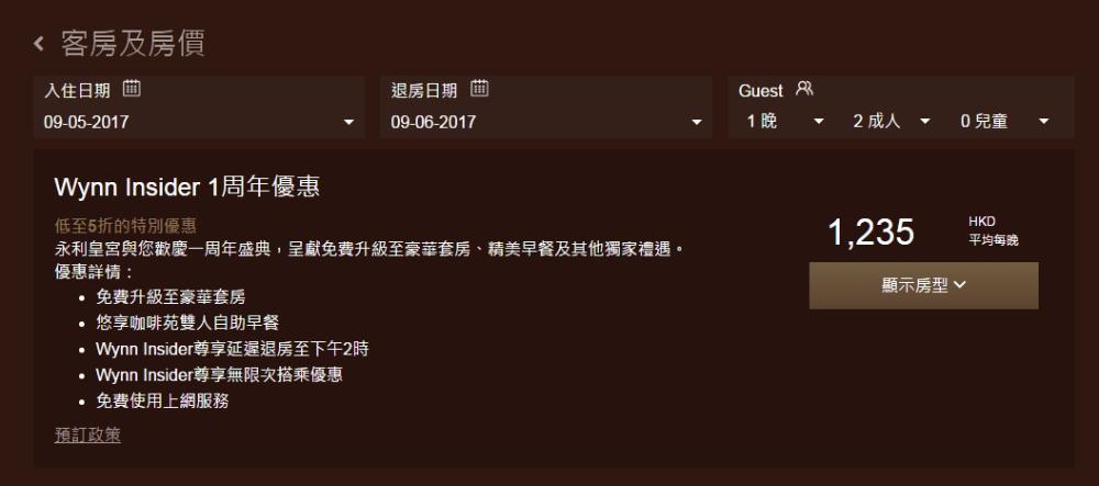 正呀!2016年新開既 澳門永利皇宮 Wynn Palace 官網今日出左周年紀念優惠,每晚房價 HK$1,235起,連稅 HK$1,470,仲包雙人同餐、延遲退房至下午2時,最吸引係免費升級至豪華套房,如升級至最大的珀麗套房,有成136平方米(1,460平方呎),最啱帶小朋友去玩。如果唔介意有無升級,Expedia都減左價,同樣包早餐,仲可以用埋85折或88折碼,85折後連稅只係HK$1,286,仲平官網二百。