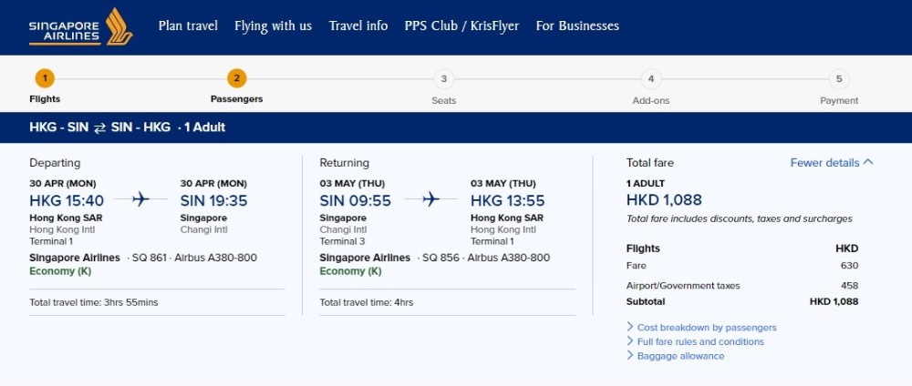 新加坡航空 服務好就係人都知,宜加仲出左超平飛,連跨五一都有,香港飛新加坡 HK$630起(連稅 HK$1,088),千一蚊都唔洗,仲要包30kg行李同餐飲,真係仲抵過廉航,航班時間當然有限制,去程只限下午3點幾機(SQ 861),可能要請半晝假先得,回程限早上9點幾機(SQ 856),優惠適用於4至5月底出發。