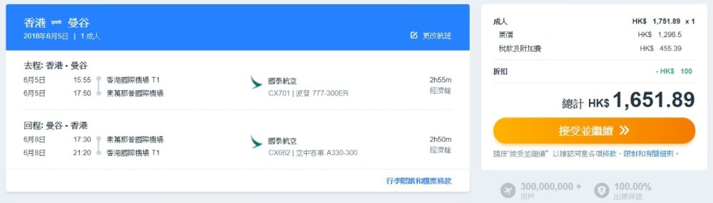 國泰都跟住減左曼谷機票,用埋Visa卡優惠碼減$100,折後 香港飛曼谷 HK$1,197(連稅 HK$1,652),雖然唔夠泰航平,但回程有下午五點機返,出發日期為5月至6月底,國泰已包30kg行李同餐飲。