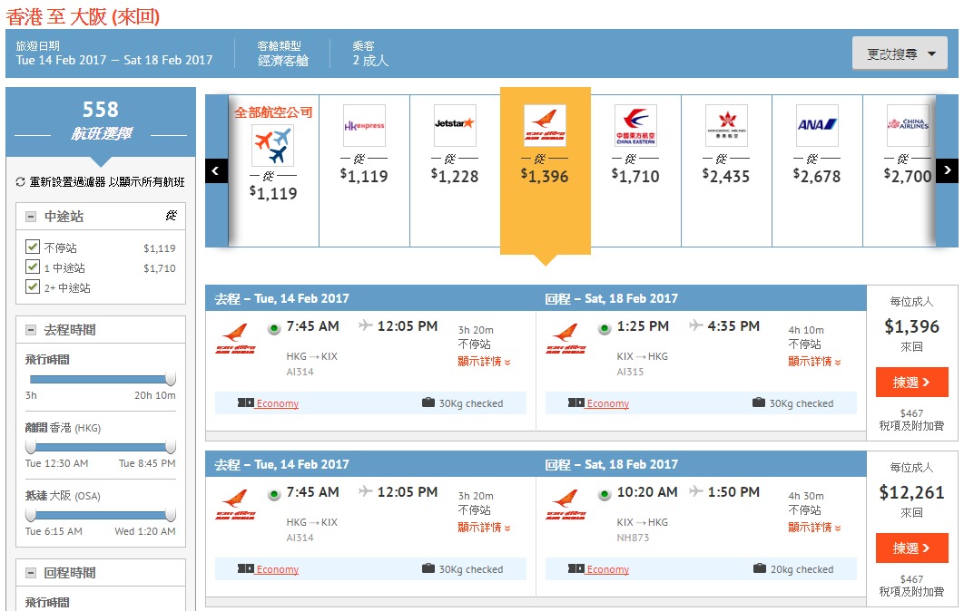 印度航空 又出大阪線優惠,香港飛大阪 來回機位HK$1,396起,連稅HK$1,863起,要2人同行先有咁平,想情人節正日出發都得,包左20kg行李寄艙,仲係坐787寬體客機,可早機去午機返。