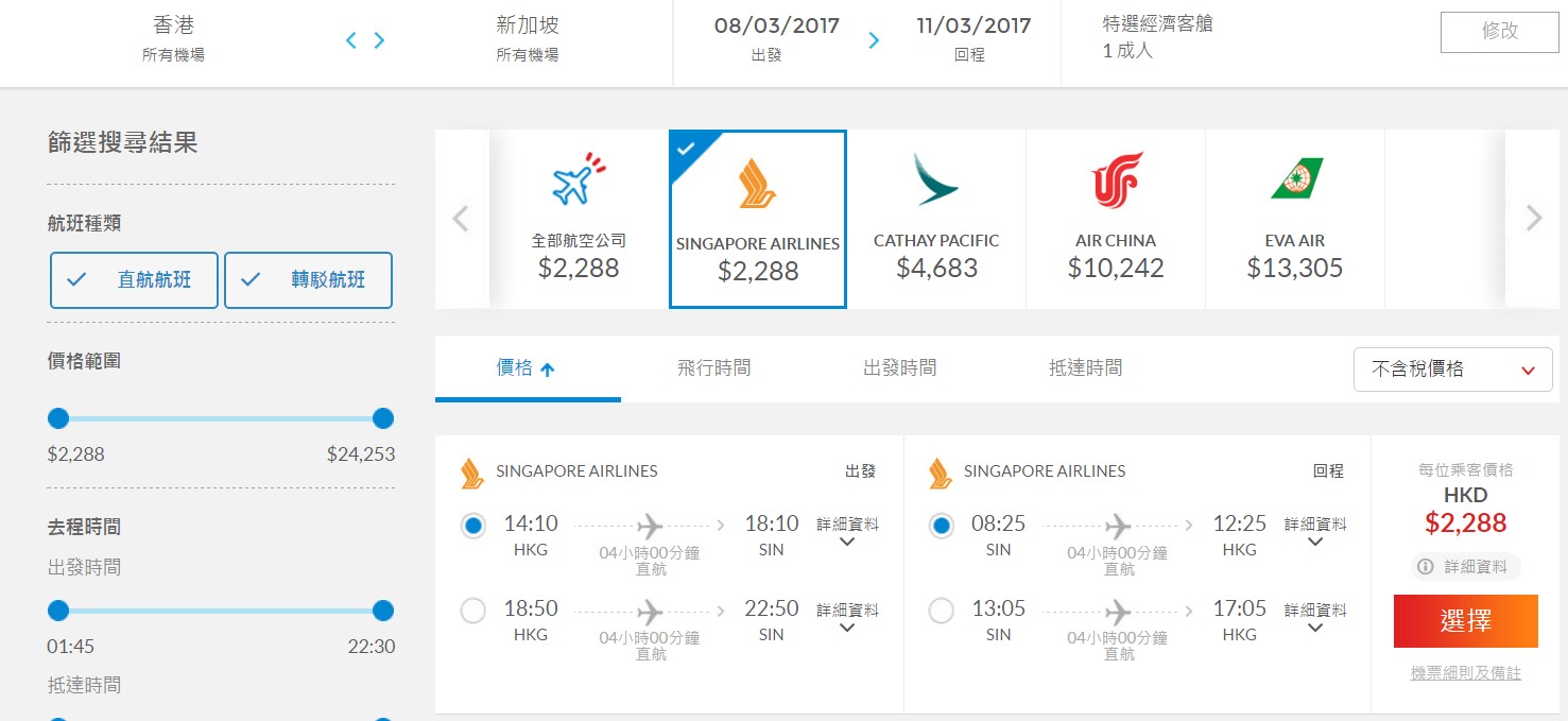 新加坡航空 除左經濟艙外,特選經濟艙都減,香港飛新加坡 HK$2,288起,連稅HK$2,731,特選經濟艙已包35kg行李,特選經濟艙坐位有長D,又可享用名廚有約服務,預訂定餐食,呢個價係Hutchgo先有,比官網平同其他網站千幾二千蚊,仲會送1張機場快線來回車票比你添。