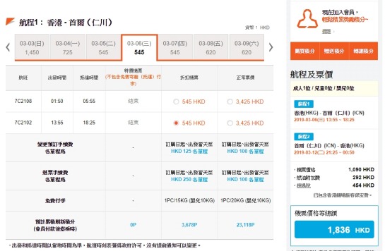 濟州航空 今日出左2至3月出發優惠,香港飛 首爾 單程 HK$545起(來回連稅HK$1,836)、澳門飛 首爾 單程 MOP 455起(來回連稅MOP 1,634),呢個價已包左香港出發加收既燃油費,價錢唔係太吸引,港航Flash Sale仲平D,香港出發包左15kg行李寄艙,而澳門出發只包10kg手提行李,Check過平飛係3月份先有。