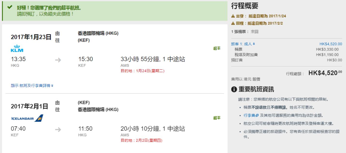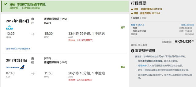 投完票又要做返D更正經既野,諗下點飛去冰島睇極光好,原來皇家荷蘭航空+冰島航空去冰島可以咁平,香港出發冰島-雷克雅維克HK$3,330起,連稅HK$4,520,已包餐飲及23kg行李寄艙,明年3月底前出發。