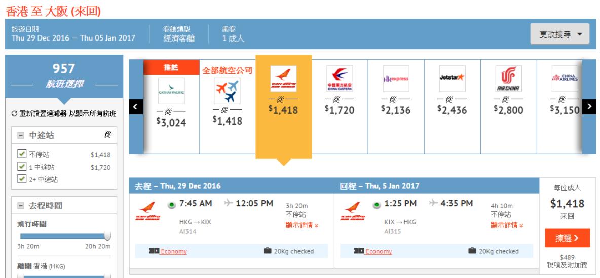 印度航空 出左大阪線優惠,香港飛大阪 來回機位HK$1,418起,用埋東亞優惠碼,連稅HK$1,707起,包左20kg行李寄艙,價錢雖然唔夠港航平,但係跨年出發都有,如12月29日飛,1月5日回,而且仲係坐787寬體客機添,航班時間都唔錯,可早機去午機返。
