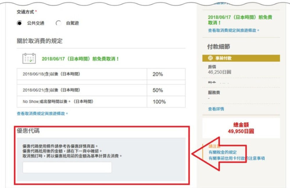 付款前輸入酒店優惠碼(同家酒店訂滿指定金額)