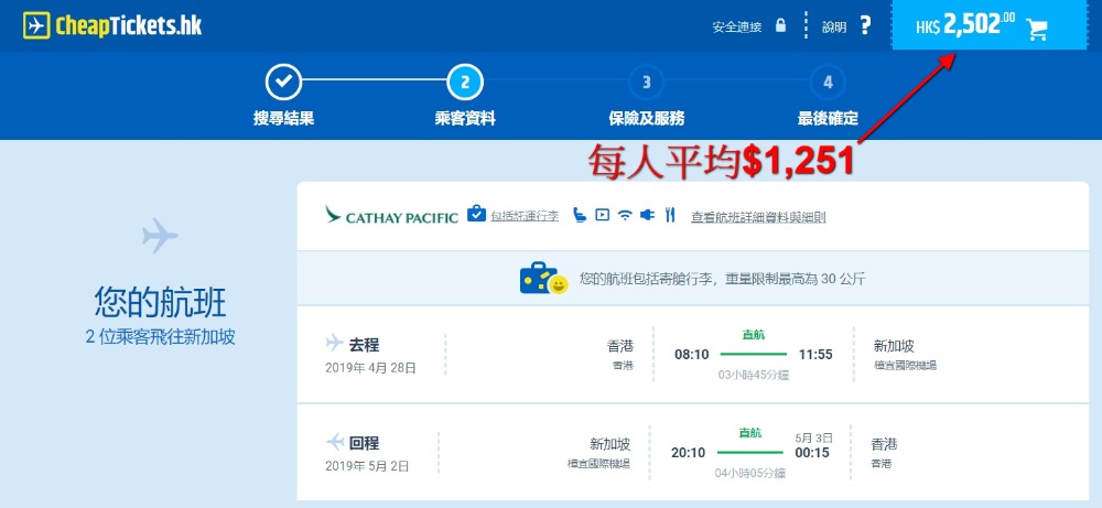 國泰2人同行新加坡仲平,擺明同新航鬥平,同樣3月底至6月出發,2人同行香港飛 新加坡 每人HK$520起(連稅HK$1,251),呢個價仲平過官網匯豐卡優惠添,Check過跨五一都有,如4月28日去,5月2日返,航班時間可以早去晚返,國泰己包30kg行李。