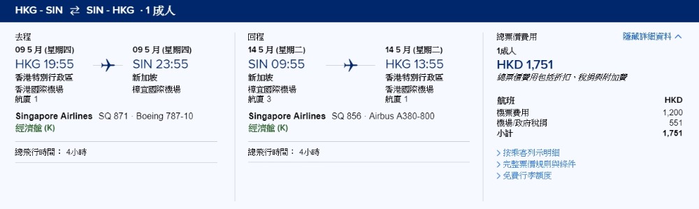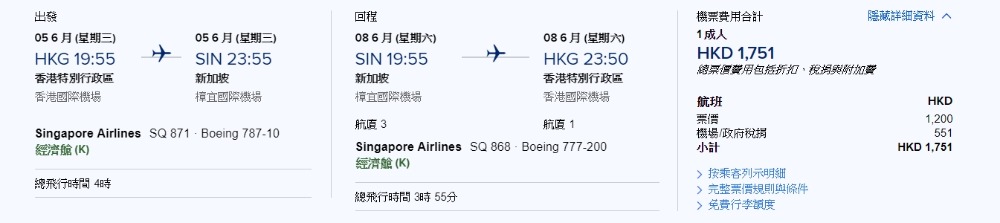 新加坡 HK$1,000起(連稅HK$1,751)