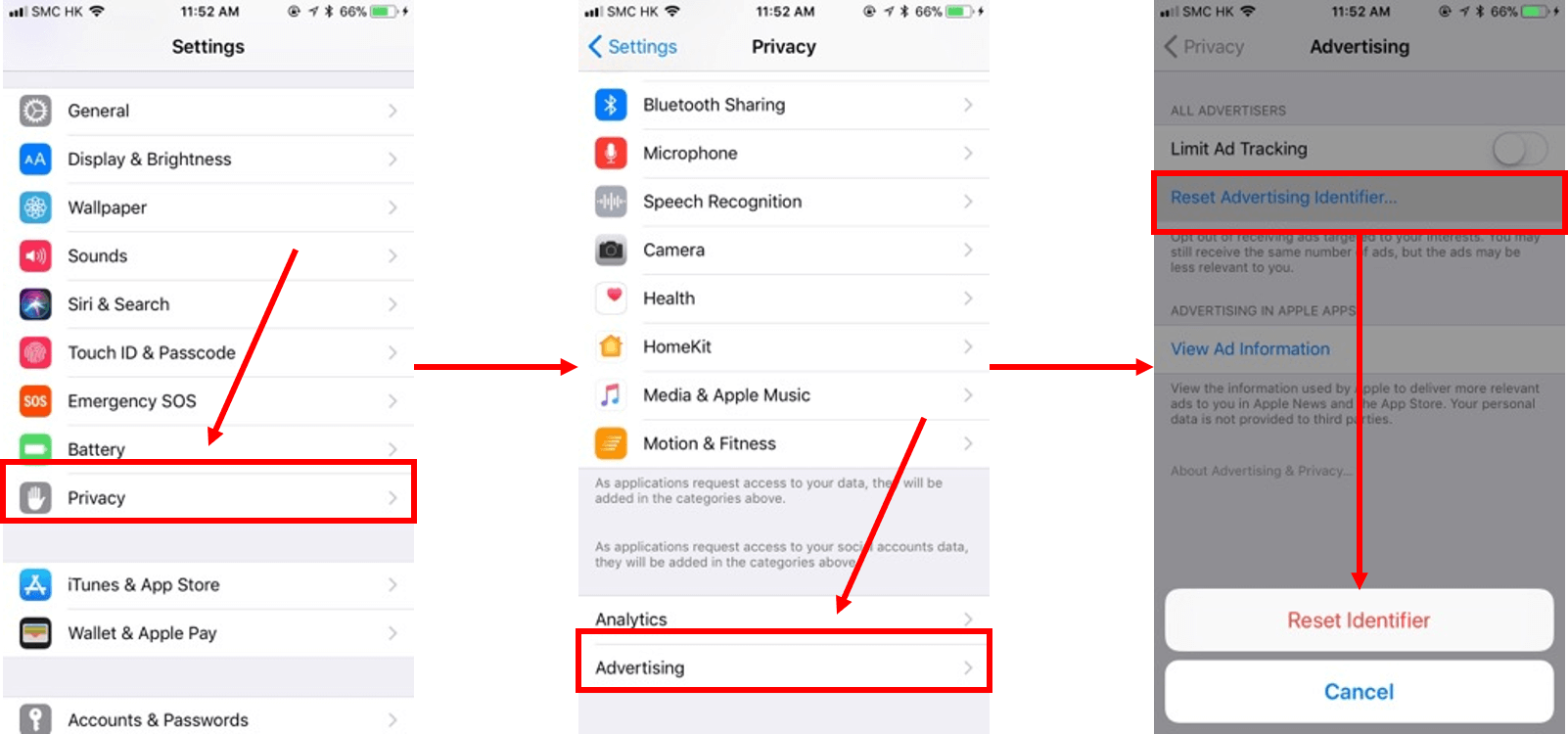 1. 請先到”Setting”->”Privacy”->”Advertising”->”Reset Advertising”->按 “Reset Identifier” (附件: Agoda_Download_Guide)
