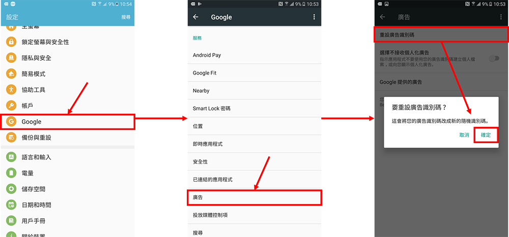 1. 先到”設定”->”Google”->”廣告”->”重設廣告識別碼”->按 “確定” (附件: Agoda_Download_Guide_Android)