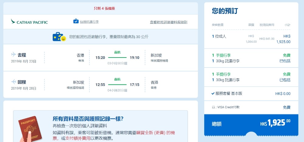 除左新航,國泰都有新加坡優惠,香港飛 新加坡 HK$1,084起(連稅HK$1,925),貴新航幾十蚊,好處係停留期有7日,check過8月23日或之後出發都有平,想暑假尾最後沖衝刺可以考慮,另外重陽都有平,如10月6日去12日返,不過中秋就無,國泰己包30kg行李。