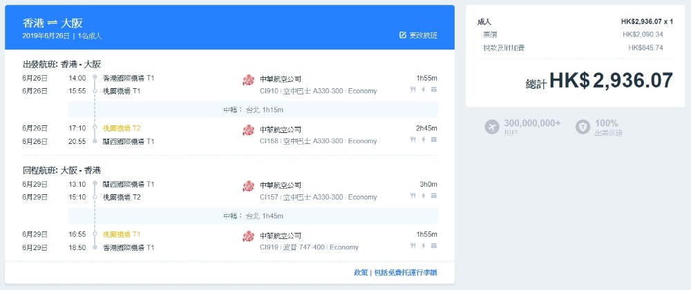 大阪 HK$2,091(連稅HK$2,937)