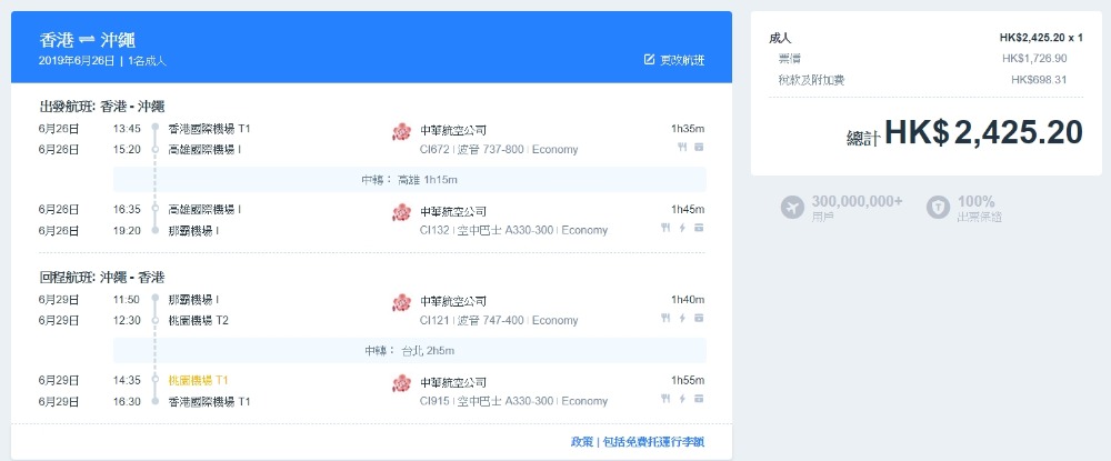 【訂票日期】即日至2019年5月31日 【出發日期】即日至2019年7月11日、8月23日至12月20日、12月27至31日、2020年1月1至22日、1月28日至3月31日 【停留期限】1個月 【訂購網址】hk.trip.com(沖繩HK$2,425) 【官方網頁】www.china-airlines.com(沖繩HK$2,636)
