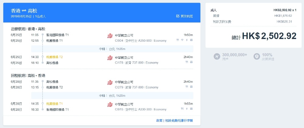 高松/廣島/宮崎 HK$1,877(連稅HK$2,503)