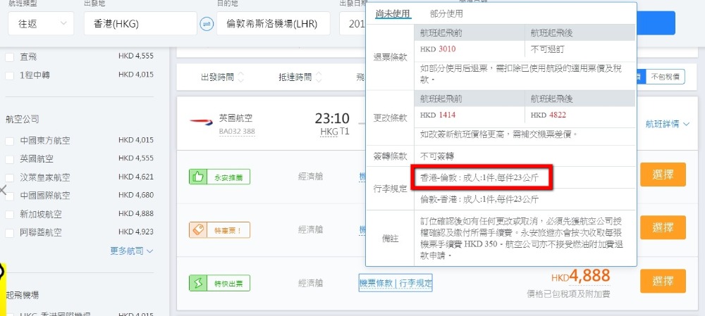 以上價錢只包機上餐飲及2件手提行李及包1件23kg行李寄艙