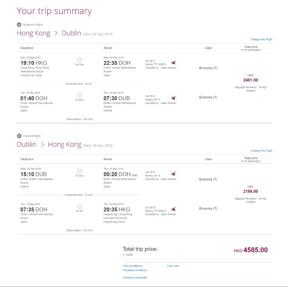 卡塔爾航空 Qatar Airways 出左英國及愛爾蘭優惠,香港 飛英國/愛爾蘭 HK$2,610起,來回連稅 都柏林 HK$4,585、倫敦(蓋特威克) HK$5,094、曼徹斯特 HK$5,540、倫敦(希思羅) HK$5,254、愛丁堡 HK$5,492、伯明翰 HK$5,768、加的夫 HK$6,119,已包左30kg行李寄艙,出發日期至明年3月底前。