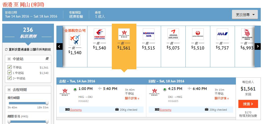 岡山 HK$1,561起,減東亞咭HK$200(連稅 HK$1,531)