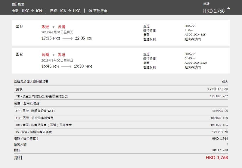 首爾 HK$1,060(連稅HK$1,768)