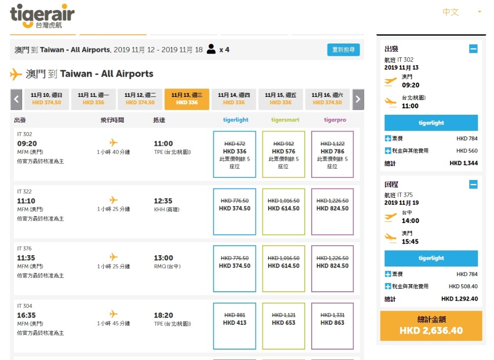 台灣虎航 今日出左七夕節優惠,11月至明年3月底前出發,4人同行 澳門 出發 台北/台中/高雄 每人單程HK$196起(來回連稅HK$659),2人同行 台北/台中/高雄 每人單程HK$224起(來回連稅HK$715),虎航只包10kg手提行李,15kg行李寄艙每程$210 。