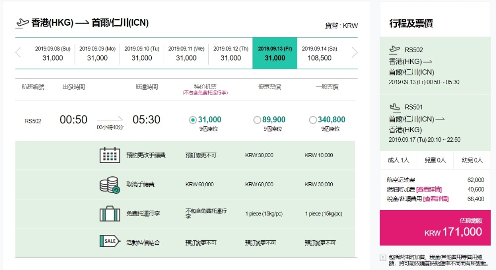 單程31,000won(約HK$201起),連稅171,000 won(約HK$1,107)