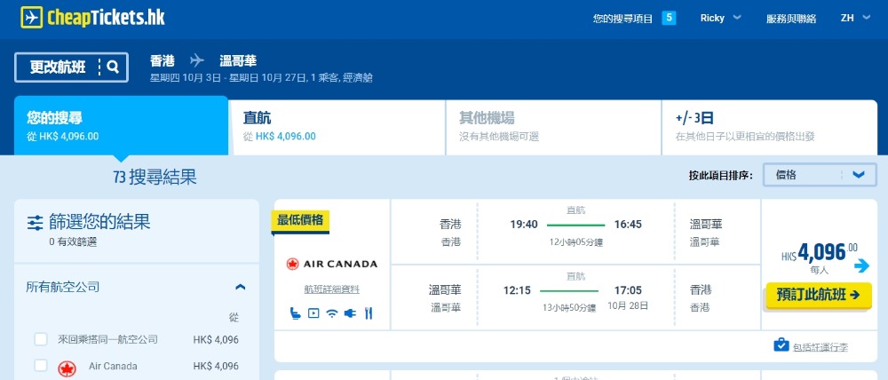 【訂購日期】即日至2019年9月4日 【出發日期】2019年9月5日至12月13日 【停留期限】3個月 【訂購日期】www.cheaptickets.hk(連稅HK$4,096) 【官方網頁】www.aircanada.com(連稅HK$4,276)