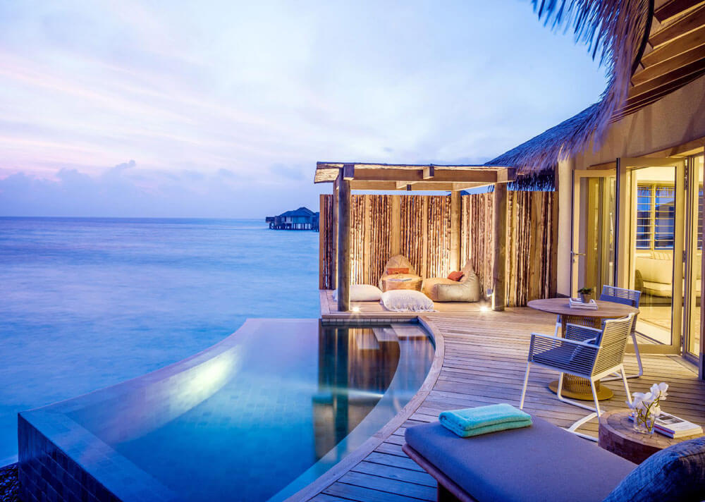 樓高兩層的潟湖別墅屬馬爾代夫首家同類型別墅,不但坐擁水上景觀,亦直通海灘和潟湖,同時附設私人無邊際泳池和按摩浴缸。
