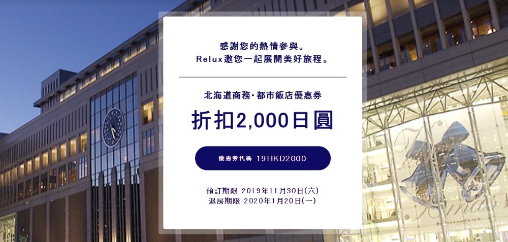 札幌/函館酒店優惠碼滿10,000円減2,000円