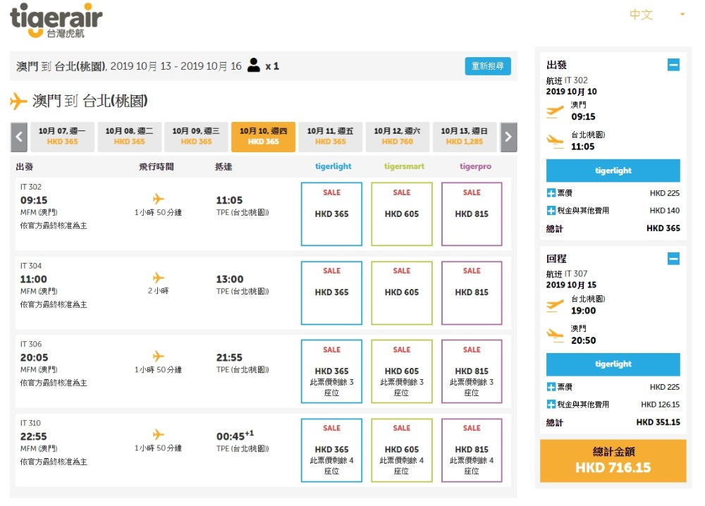 台灣虎航 啱啱出左中秋節優惠,11月底前出發,澳門 出發 台北/台中/高雄 單程HK$225起(來回連稅HK$716),check過雙十節出發都有平,虎航只包10kg手提行李,15kg行李寄艙每程$210 。