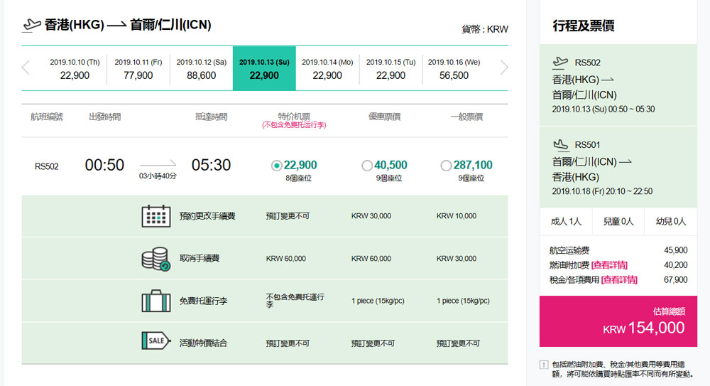 單程22,900won(約HK$150起),連稅154,000 won(約HK$1,012)
