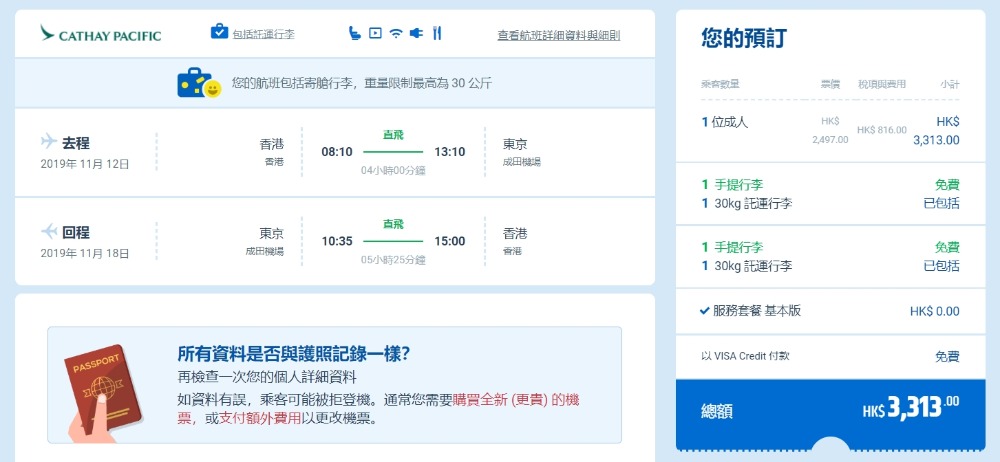 【訂購日期】即日至2019年10月2日 【出發日期】2019年10月2日至10月3日、10月6日至11月30日 【停留期限】7日 【訂購日期】www.cheaptickets.hk(連稅HK$3,313) 【官方網頁】www.cathaypacific.com(連稅HK$3,386)