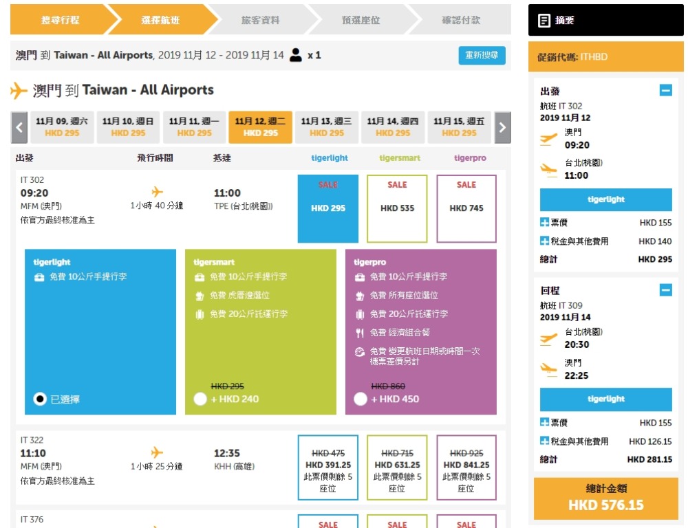 台北/台中/高雄 單程HK$155起(來回連稅HK$576)