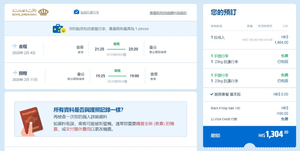 皇家約旦航空 飛曼谷又有優惠,今次唔係Last Minute出發,可以訂到2月底前出發,香港直飛 曼谷 HK$730起(連稅HK$1,319),坐787夢幻客機,皇家約旦逢二、四、六、日有航班,時間晚機去黃昏機返,已包左23kg行李寄艙。