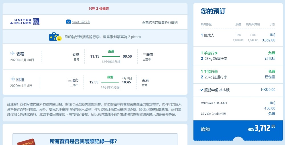 之前新航飛三藩市連稅三千八,想再平D可考慮坐聯合,聯合航空 香港 直飛 美國-三藩市 HK$1,870起 (連稅 HK$3,712),吸個價錢真係幾抵,不過出發日期限2-3月,聯合已包左2件23kg行李及機上餐飲。