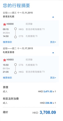 札幌HK$3,472起(連稅HK$3,708)