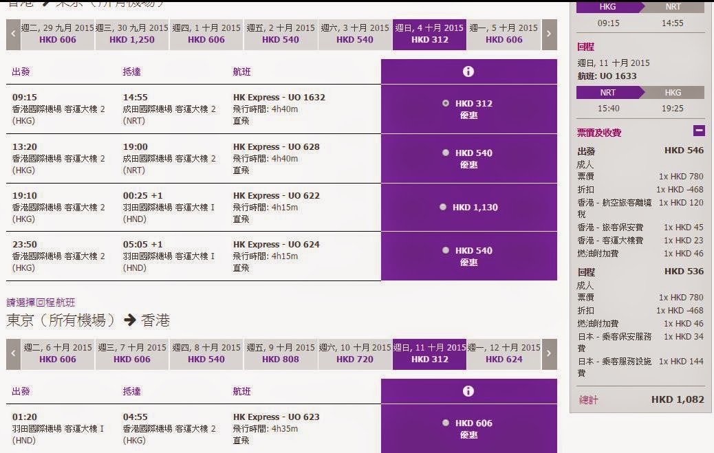 東京(成田) HK$624 (連稅HK$1,082)