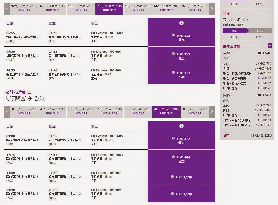 大阪 HK$624 (連稅HK$1,113)