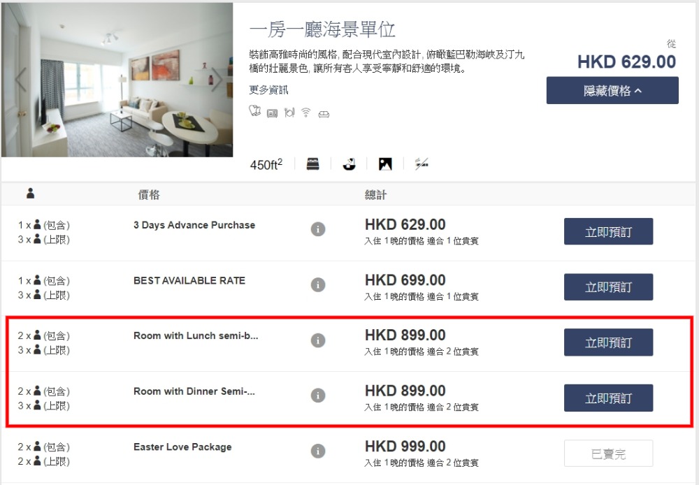 海景套房+半自助餐 每晚連稅HKHK$899起
