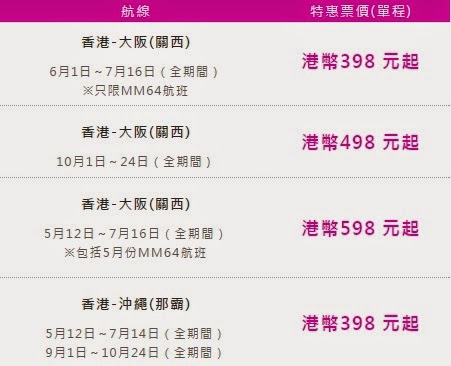 Peach 樂桃航空 聽晚(星期三)零晨12點開賣香港飛大阪/沖繩特價機票,5至10月出發,當中7月頭暑假檔期都有得平。