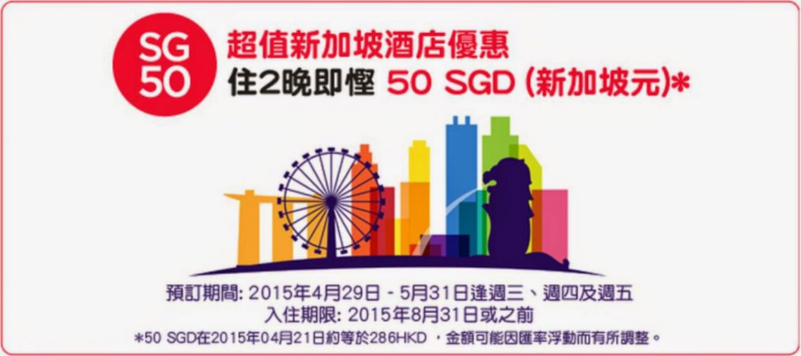 Agoda 推出新加坡酒店優惠,係4月29日(星期三)起至5月31日期間,每逢星期三、四、五訂新加坡酒店2晚或以上都即減 新幣50(約 HK$290 /TWD 1,152)。