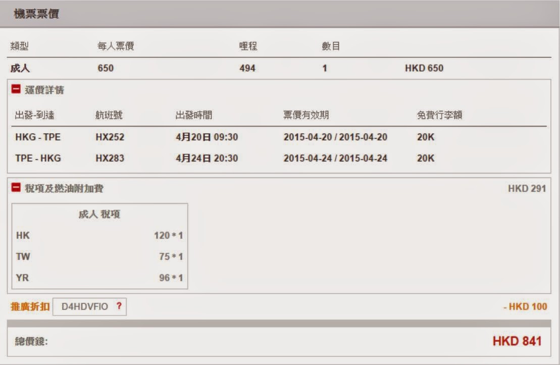 香港往返台北$650起,減「週末熱價」$100,連稅$841