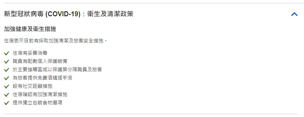 在「新常態」下,旅客無疑會更重視酒店的健康及衛生措施,以確保旅程更安全舒適。因此,Hotels.com在住宿資料版面上加入該酒店所實施的衛生及清潔政策,讓旅客可輕鬆一覽酒店的最新安排。