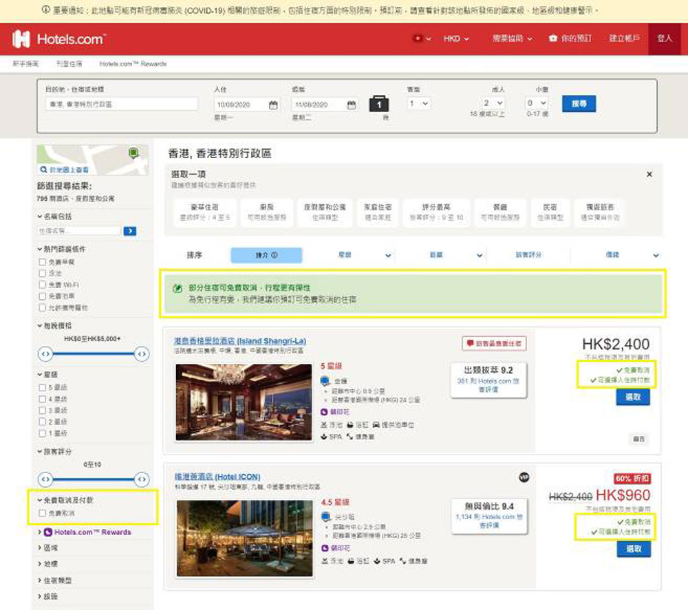 與此同時,除了一系列健康及衛生措施,另一個「旅遊新常態」便是旅客對行程彈性的需要,而一向以旅客為本的Hotels.com 便在篩選功能内新增了「免費取消及付款」選項,讓旅客在預訂酒店時,可篩選符合要求的酒店。Hotels.com更在酒店資料及付款頁面加入免費取消提示信息,以提示旅客該酒店可「免費取消及付款」,讓旅客可更放心計劃將來的旅程。