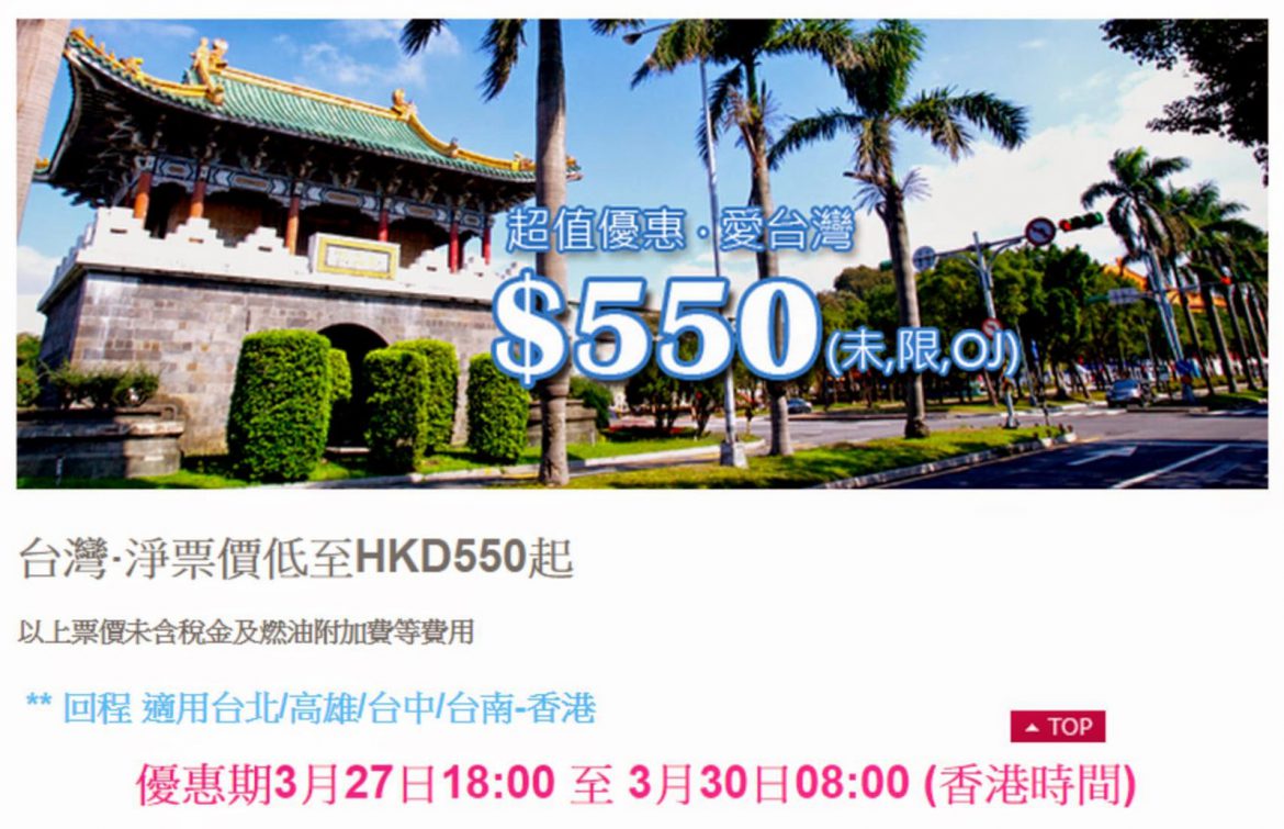 香港往返台北/高雄/台南 $550起(連稅$875)