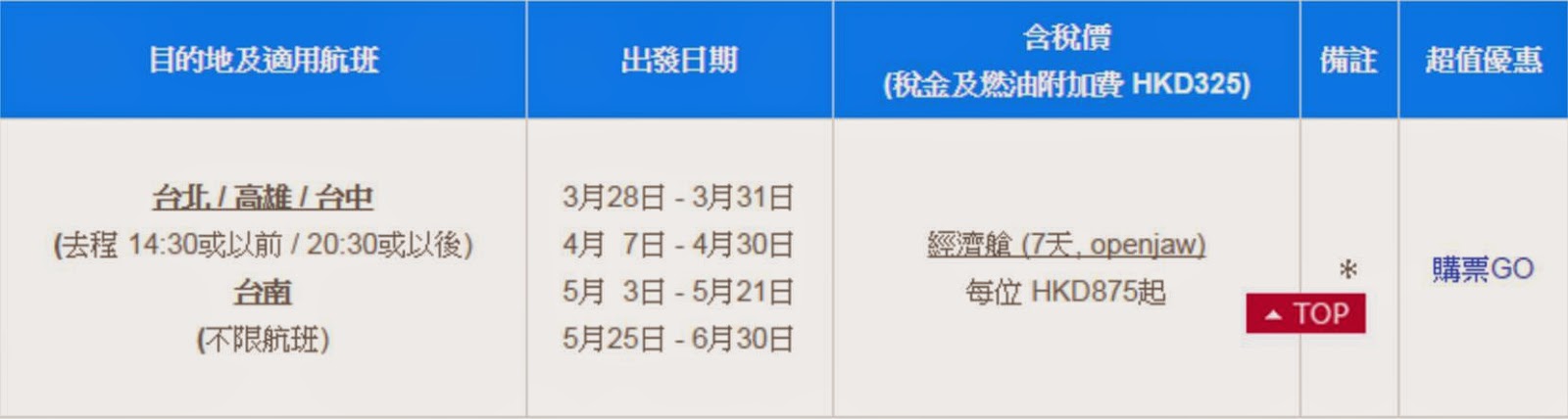 出發日期:即日至2015年3月31日、4月7日至4月28日、5月3日至5月21日、5月25日至6月30日