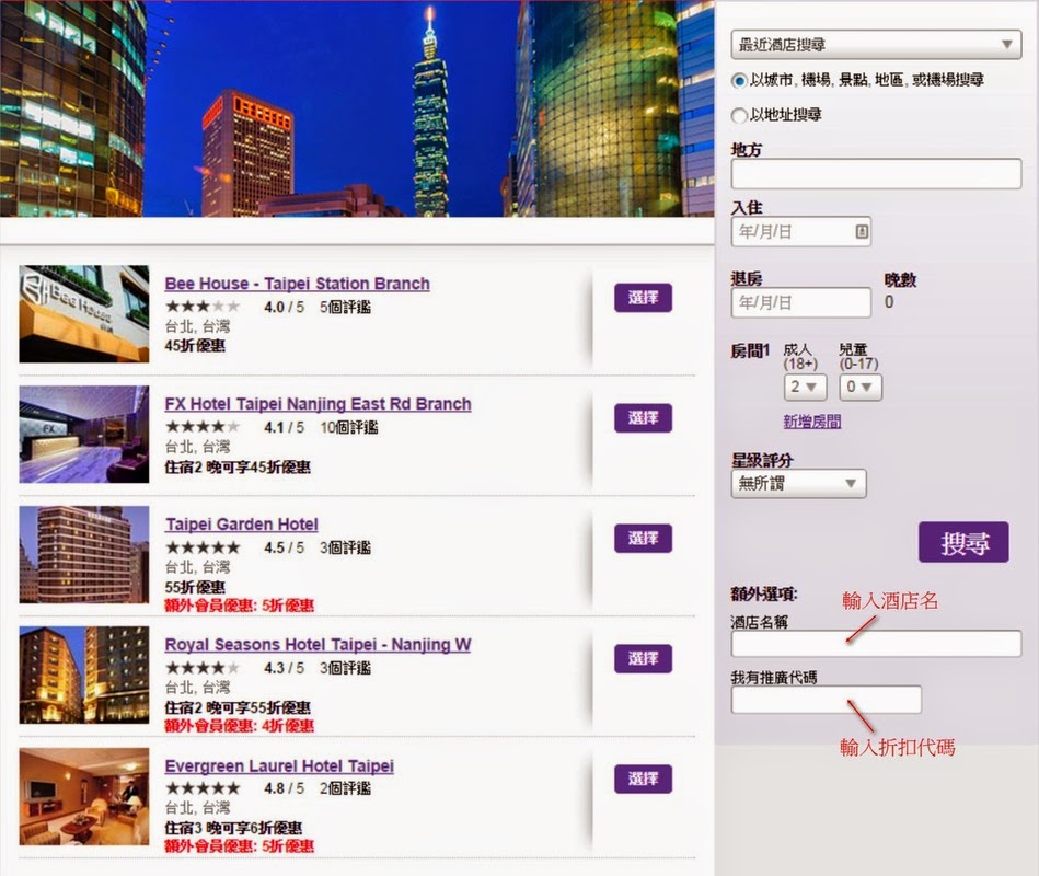 搜尋酒店時輸入87折優惠碼:
