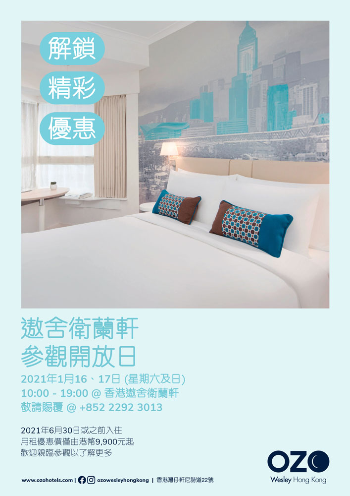 香港遨舍衛蘭軒宜加出左月租優惠勁平,連住三十晚,標準客房每晚只係HK$300,月租只係HK$9,900,灣仔區啲service apartment以前閑閑地都要二萬蚊一個月,所以疫情下先有咁平,如果有需要月租可以考慮下,Check過佢唔係檢疫酒店。另外,1 月 16 及 17 日(星期六及日)酒店會有開放日,歡迎有興趣人士參觀。