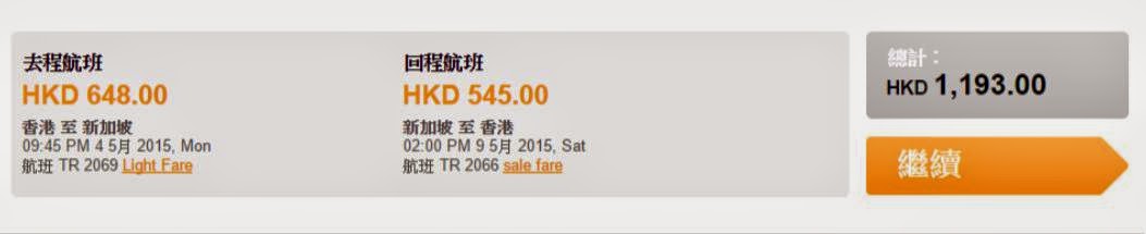 香港飛新加坡單程$648(連稅),來回機票$1,193(連稅)