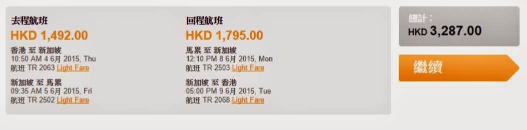 香港飛馬累單程$1,650(連稅),來回機票$3,287(連稅)