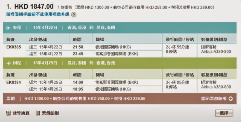 Emirates阿聯酋航空【香港直航曼谷】來回機票HK$1,300起(連稅HK$1,847),坐A380機。